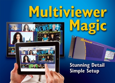 The Avenue Multiviewer accepts all standard SD, HD and 3 Gb/s video formats. The MV82 has 8 source inputs and 2 outputs, the MV164 has 16 source inputs and 4 outputs. Outputs can be genlocked and timed with respect to house reference. 1080i or 1080p SDI are output at 59.94 or 50 Hz. When you need to drive an HDMI video monitor, use a BrightEye 81 SDI to HDMI converter at the monitor.